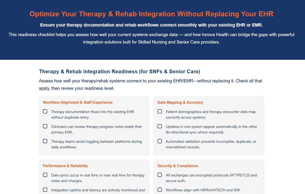 Help IT directors, therapy managers, and SNF administrators pinpoint how well their therapy and rehab data flows within their current EHR — and where optimization can drive better outcomes and efficiency.